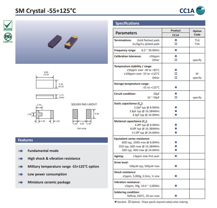 高利奇晶振,CC1A晶振,8038二腳晶振貼片晶振本身體積小,超薄型石英晶體諧振器,特別適用于有目前高速發展的高端電子數碼產品,因為晶振本身小型化需求的市場領域,小型?薄型是對應陶瓷諧振器(偏差大)和普通的石英晶體諧振器(偏差小)的中間領域的一種性價比較出色的產品.產品廣泛用于筆記本電腦,無線電話,衛星導航HDD, SSD, USB, Blu-ray等用途,符合無鉛焊接的高溫回流焊曲線特性