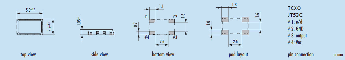 Jauch貼片晶振,JT53C晶振,5032溫補晶振具有最適合于移動通信設備用途的高穩定的頻率溫度特性.為對應低電源電壓的產品.(可對應DC +1.8 V±0.1 V to +3.2 V±0.1 V )高度:最高1.0 mm,體積:0.007 cm3,重量:0.024g,超小型,輕型.低消耗電流,表面貼片型產品.(可對應回流焊) 無鉛產品.滿足無鉛焊接的回流溫度曲線要求.
