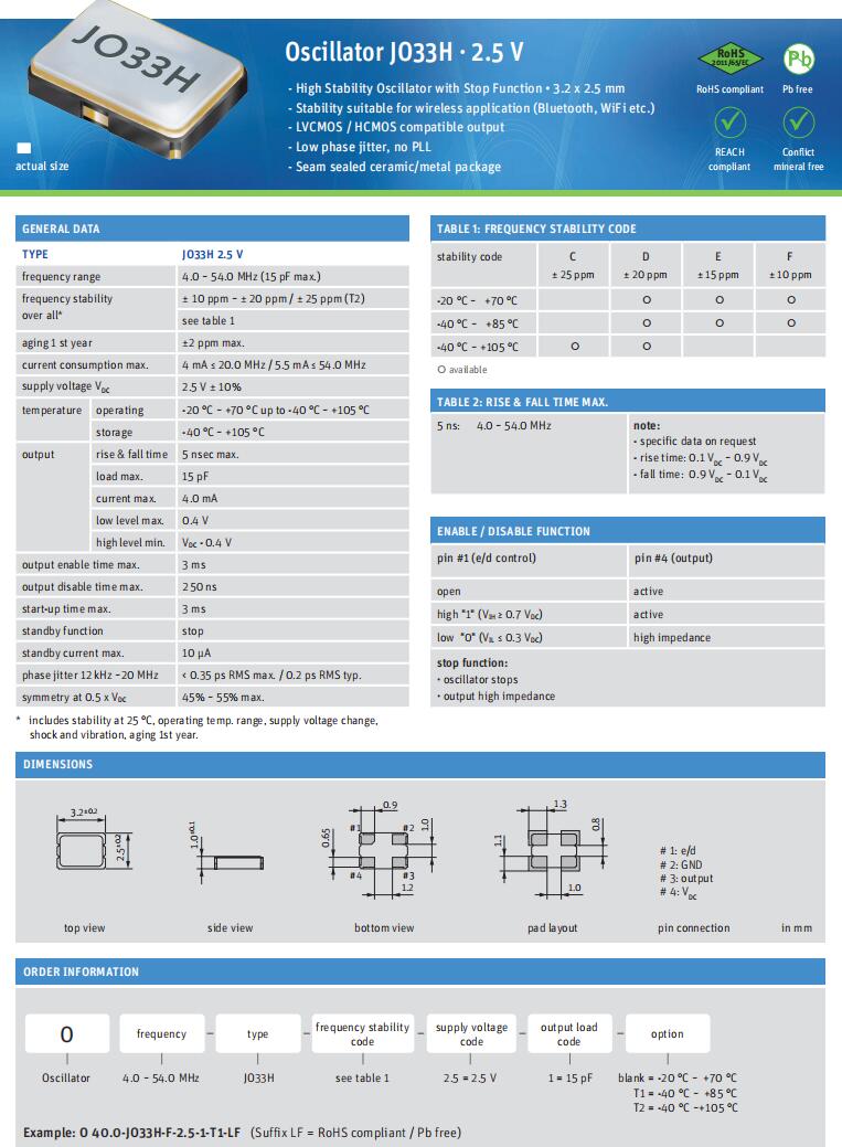 Jauch品牌,O 19.20-JO33H-F-2.5-1-T1-LF,6G移動通信晶振,Jauch晶振,進口晶振品牌,JO33H石英晶體振蕩器,O 19.2-JO33H-F-2.5-1-T1-LF晶振,有源晶振,3225封裝晶振,四腳貼片晶振,頻率19.2MHz,電壓2.5V,工作溫度-40~85°C,頻率穩定性10ppm,高品質晶振,高可靠性晶振,LVCMOS / HCMOS兼容輸出,6G移動通信晶振,數碼產品晶振,物聯網晶振,DVD家電影音系統晶振.