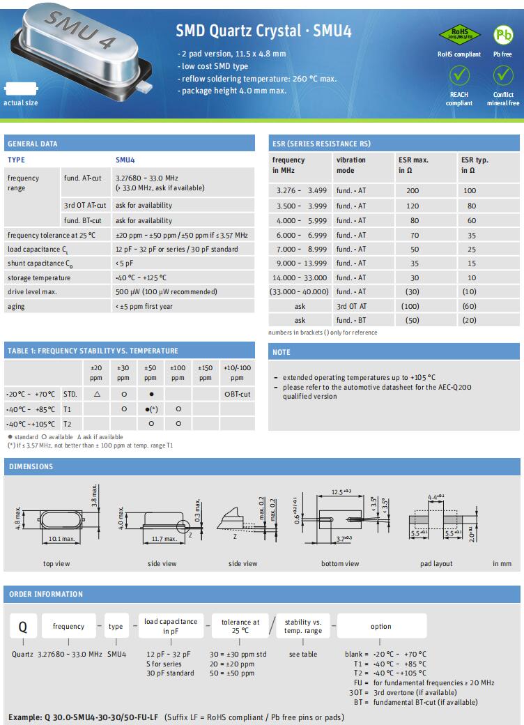 Q 20.0-SMU4-30-30/50-T2-FU-LF-Jauch品牌-6G低成本晶振,Jauch晶振,SMU4進口晶振,無源晶振,Q 20.0-SMU4-30-30/50-T2-FU-LF晶振,貼片晶振,石英晶體,頻率20MHz,負載30pF,工作溫度-40~105°C,頻率穩定性50ppm,耐高溫晶振,高性能晶振,低成本晶振,小家電應用晶振,儲存卡晶振,音頻系統晶振,數字設備晶振.