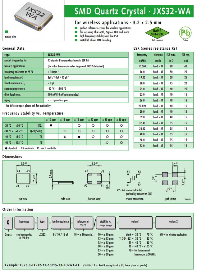 Q 32.0-JXS32-12-10/10-FU-WA-LF 3225 32MHz 12PF 10PPM,歐美進口晶振,接縫密封陶瓷/金屬封裝,擴展溫度范圍可用,高機械可靠性類型可用,用于汽車類型,見汽車數據表