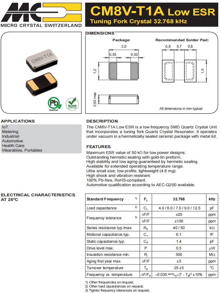 | CM7V-T1A-Low-ESR-32.768k-9pF-20-TB-QA | Micro Crystal | 晶體 32.768 kHz 9.0 pF +/-20 PPM LOW ESR |