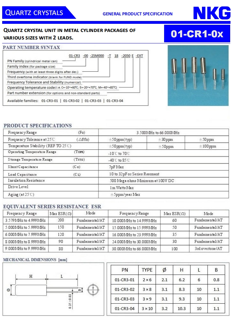 NKG晶振|01-CR3-02-11M288-T16-2050E-EXT|3×8圓柱晶振規格表