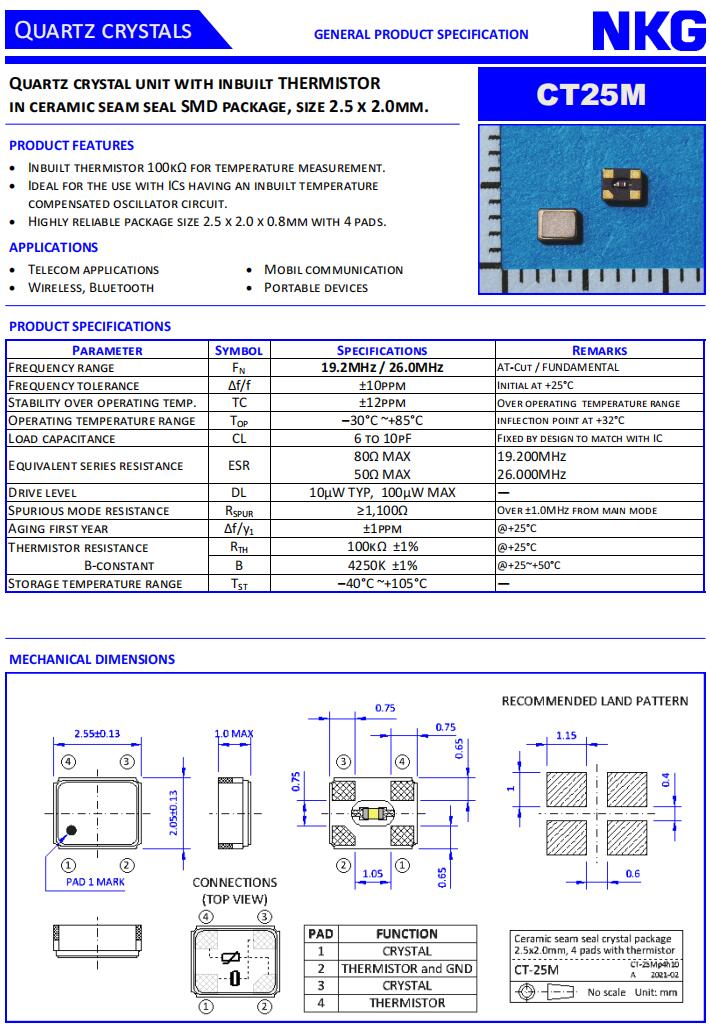 NKG晶振|CT25M26.000F10V11-100|2520mm晶振,NKG晶振,CT25M進口晶振,熱敏晶體,CT25M26.000F10V11-100晶振,貼片石英晶振,晶體諧振器,2520mm晶振,四腳封裝晶振,SMD晶振,頻率26MHz,負載10pF,工作溫度-30~85°C,頻率容差10pm,高精度晶振,輕薄小晶振,無鉛環保晶振,無線通信晶振,移動應用晶振,無線局域網晶振,藍牙音響晶振.