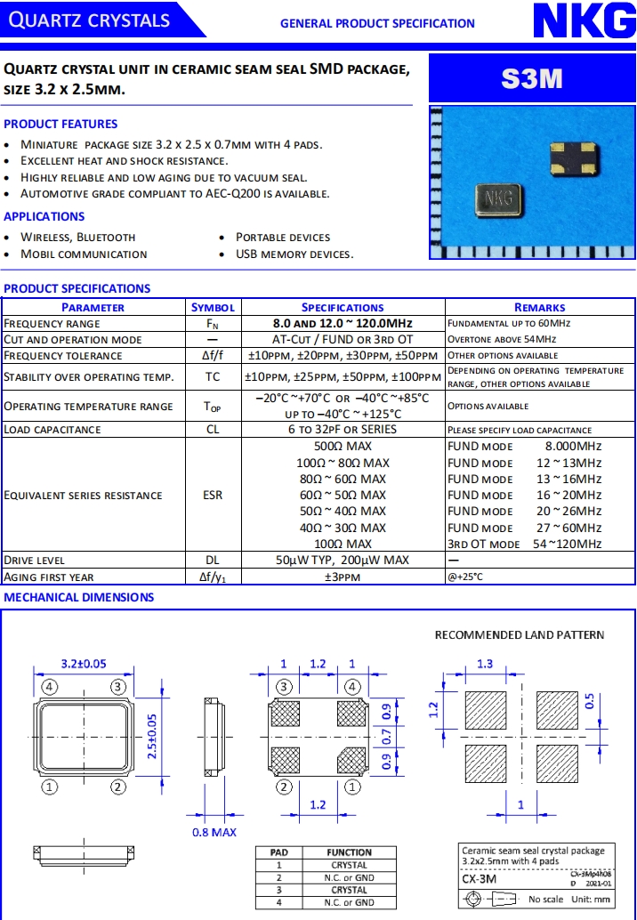 NKG晶振|S3M48.000F18M23-EXT|3225小體積晶振規格表