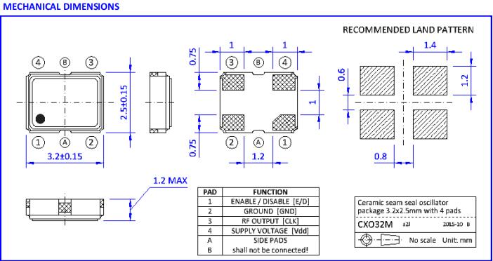 ●SMD封裝尺寸為3.2 x 2.5 x 1.2mm,帶有4個襯墊