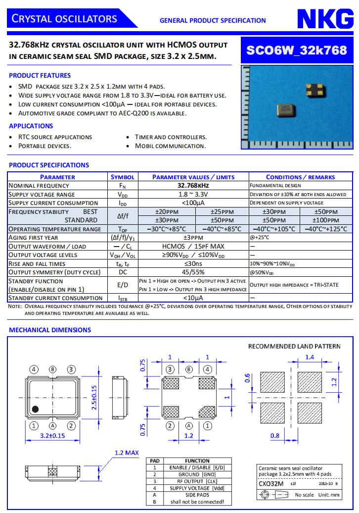 NKG晶振|SCO6W-D-32K768-YTS-EXT|3225音叉晶體特點