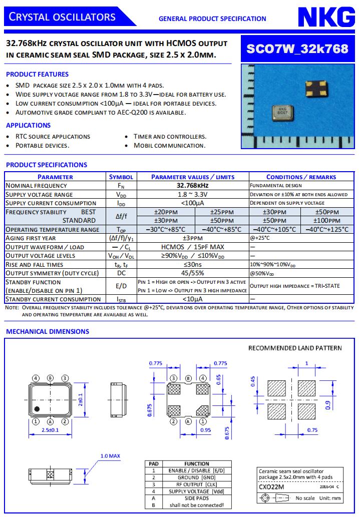 NKG晶振|SCO7W-32K768-WTS-EXT|32.768K振蕩器特點