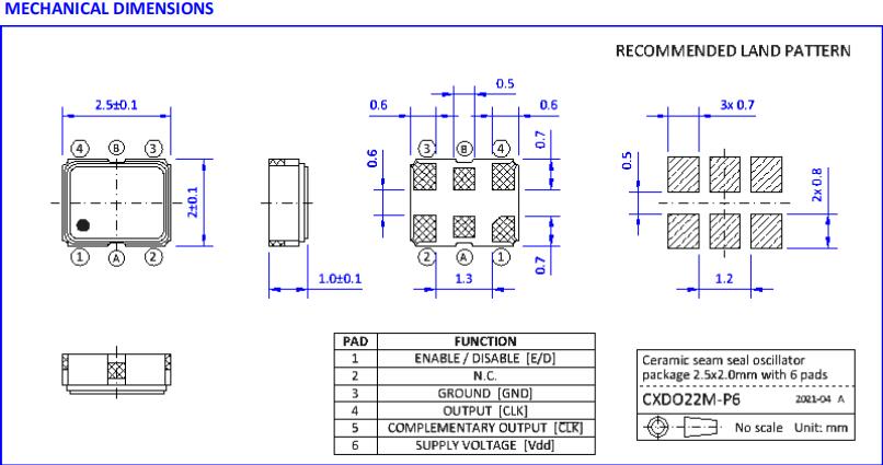●SMD封裝尺寸為2.5 x 2.0 x 1.0mm,帶有6個襯墊