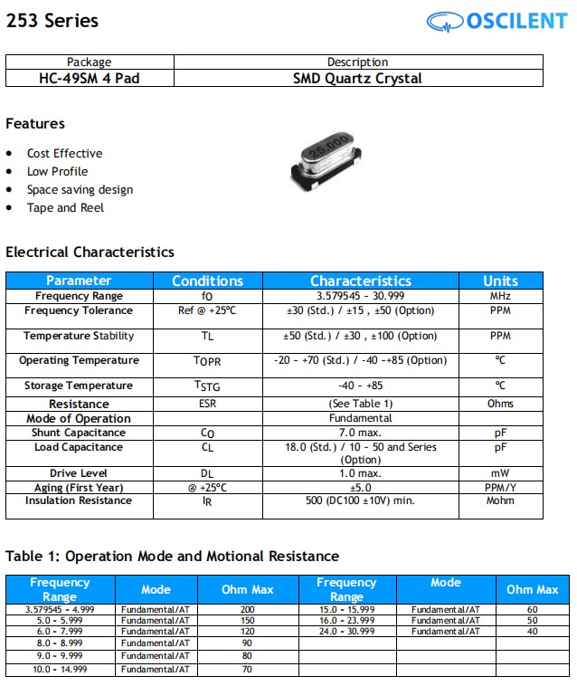 美國Oscilent晶振,253-25.0M-18-15GW-TR,6G低成本晶振規格表