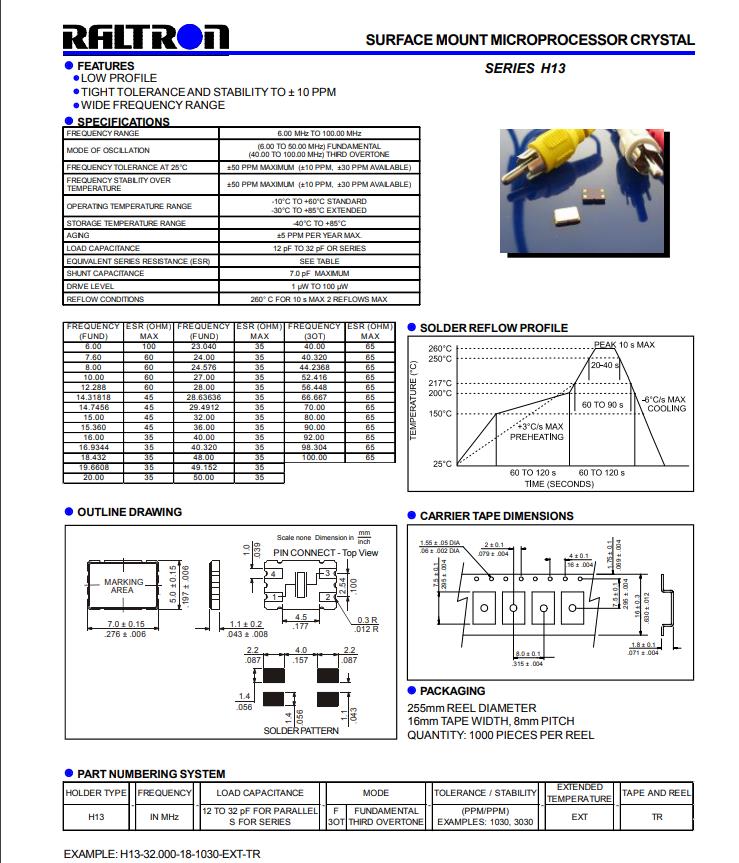 | Raltron原廠編碼 | 型號 | 頻率 | 尺寸 | 頻率偏差 | 頻率穩定度 | 負載 | 工作溫度 |