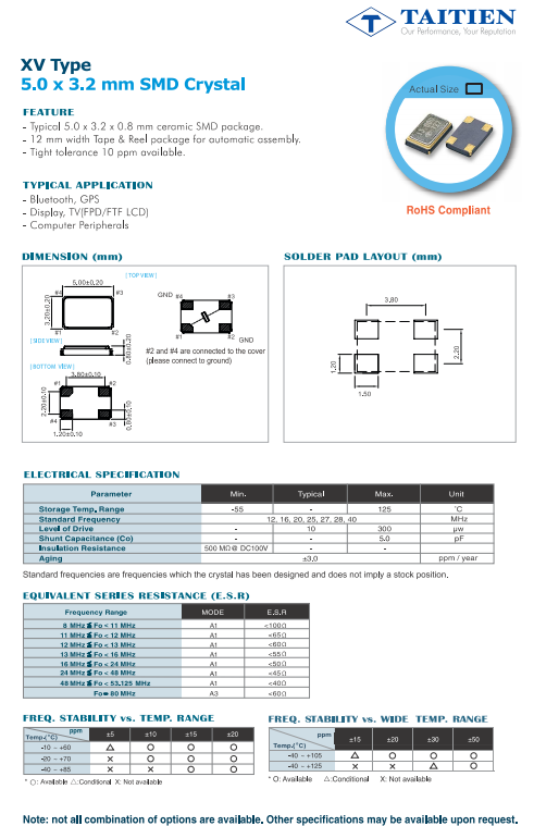 | TAITIEN原廠編碼 | 生產廠家 | 型號 | 頻率 | 頻率穩定度 | 頻率偏差 | 負載電容 |