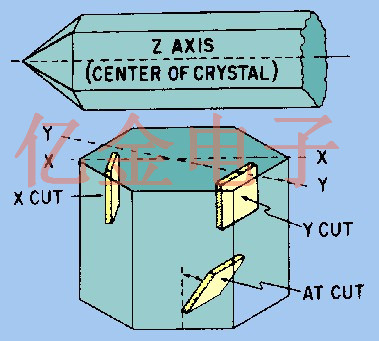 電路中使用的晶體是從天然晶體切割的薄片,并被研磨到適當的厚度以獲得所需的諧振頻率.對于任何給定的晶體切割,晶體越薄,諧振頻率越高.晶體的“切割”(X,Y,AT等)意味著從天然晶體切割出可用石英晶體的精確方式.在圖2-19中可以看到一些典型的晶體切口.