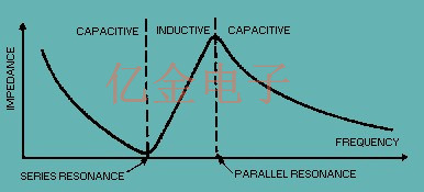 由于串聯調諧電路用作諧振點之上的電感器,貼片晶振晶體單元變得等效于電感器并且與等效電容器C1并聯(圖2-20的視圖(B)).在串聯諧振點以上的某個頻率,晶體單元將充當并聯調諧電路.并聯調諧電路在并聯諧振頻率下具有最大阻抗,并且在并聯諧振下電感性地起作用(圖2-21).因此,在某些頻率下,取決于晶體的切割,晶體單元將用作并聯調諧電路.