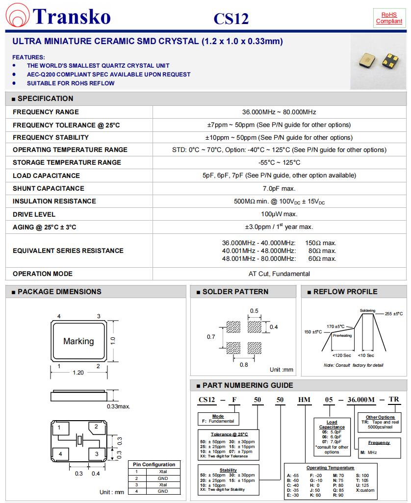 Transko晶振,CS12-F3030EQ06-40.000M-TR,6G光纖通道晶振,Transko晶振,歐美進口晶振,CS12無源晶振,石英晶體諧振器,CS12-F3030EQ06-40.000M-TR晶振,1210mm晶振,四腳貼片晶振,頻率40MHz,負載6pF,頻率公差30ppm,工作溫度-30~85°C,超小型晶振,耐高溫晶振,6G光纖通道晶振,GPS導航應用晶振,通訊設備晶振,便攜式設備晶振.