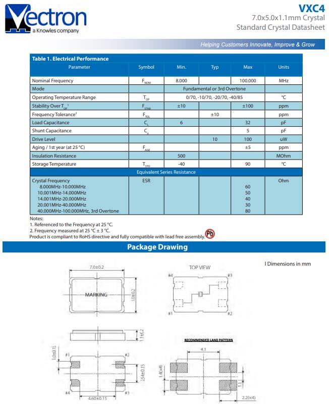 Vectron Crystal,VXC4晶振,7050四腳晶振小型貼片石英晶振,外觀尺寸具有薄型表面貼片型石英晶體諧振器,特別適用于有小型化要求的市場領域,比如智能手機,無線藍牙,平板電腦等電子數碼產品.晶振本身超小型,薄型,重量輕,晶體具有優良的耐環境特性,如耐熱性,耐沖擊性,在辦公自動化,家電相關電器領域及Bluetooth,Wireless LAN等短距離無線通信領域可發揮優良的電氣特性,滿足無鉛焊接的回流溫度曲線要求.