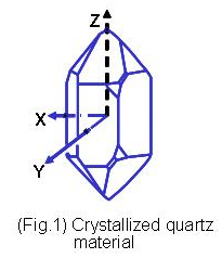 石英是由硅原子和氧原子組合而成的二氧化硅(Silicon Dioxide, SiO2), 以32點群的六方晶系形成的單結晶結構﹝圖一﹞.單結晶的石英晶體結構具有壓電效應特性, 當施加壓力在晶體某些方向時, 垂直施力的方向就會產生電氣電位. 相對的當以一個電場施加在石英晶體某些軸向時, 在另一些方向就會產生變形或振動現象. 掌握單結晶石英材料的這種壓電效應, 利用其發生共振頻率的特性, 發揮其精確程度作為各類型頻率信號的參考基準, 就是水晶震蕩器的設計與應用. 因為石英晶體具有很高的材料Q值,所以絕大部份的頻率控制組件,如共振子及振蕩器,都以石英材料為基礎. 以石英為基礎的頻率控制組件可以依其壓電振動的屬性, 可以分為體波(bulk wave)振動組件及表面聲波(surface acoustic wave)振動組件.