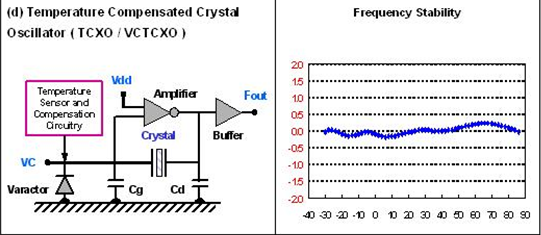 為了滿足應用面需求而言, 石英晶體振蕩器內部的振蕩線路有以基本波或三倍頻不同方式. 若要達到數佰兆赫的輸出頻率時, 振蕩線路后級可以采用鎖相回路方式或倍頻方式, 將較低頻率的石英振蕩頻率提升. 對于輸出端的輸出準位及輸出波形也有各類不同需求,如CMOS, LVPECL, LVDS…..等. 這些規格都要仔細的定義.在(如圖)提供了數種石英振蕩器輸出頻率對溫度變化的穩定性示義圖.