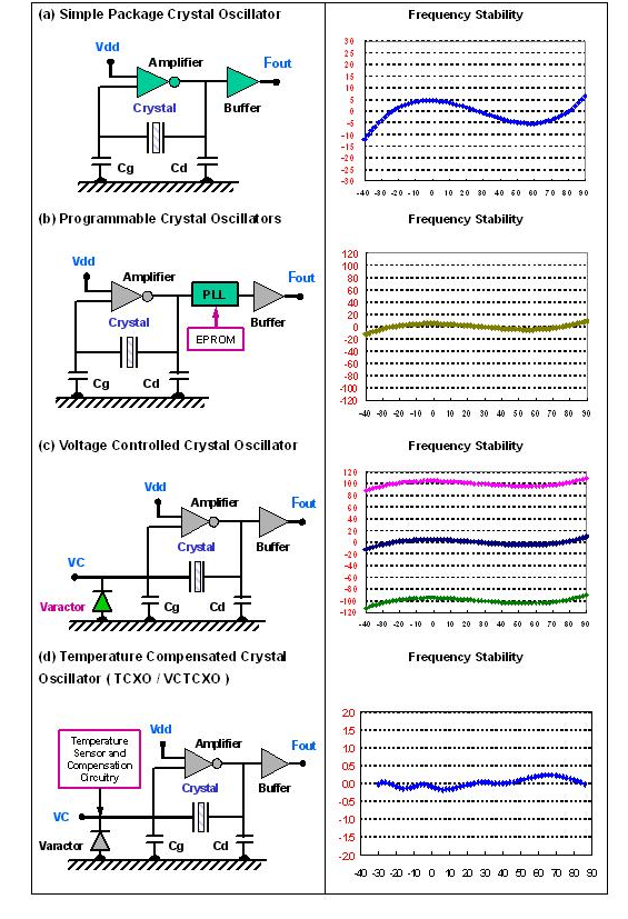為了滿足應用面需求而言, 石英晶體振蕩器內部的振蕩線路有以基本波或三倍頻不同方式. 若要達到數佰兆赫的輸出頻率時, 振蕩線路后級可以采用鎖相回路方式或倍頻方式, 將較低頻率的石英振蕩頻率提升. 對于輸出端的輸出準位及輸出波形也有各類不同需求,如 CMOS, LVPECL, LVDS…..等. 這些規格都要仔細的定義.在(如圖)提供了數種石英振蕩器輸出頻率對溫度變化的穩定性示義圖.