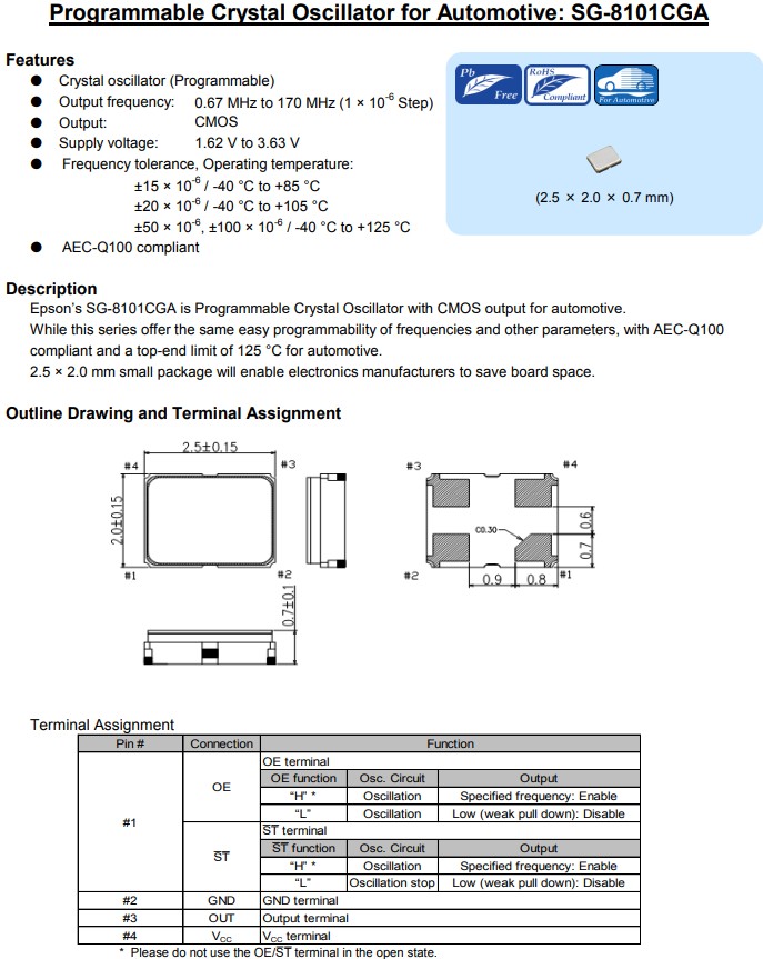 愛普生晶振SG-8101CGA是用于汽車的CMOS輸出可編程晶體振蕩器。 雖然這一系列提供了同樣容易編程的頻率和其他參數,與AEC-Q100符合汽車應用的125℃上限。小體積尺寸2.5x2.0mm四腳貼片晶振,小封裝將幫助電子制造商節省電路板空間,頻率范圍-0.67MHz至170MHz(1ppm步進),電源電壓-1.62V至3.63V,功能-輸出使能(OE)或待機(ST),被廣泛用于汽車電子應用,音響、藍牙、雷達、時鐘、顯示屏,智能手機,物聯網等。