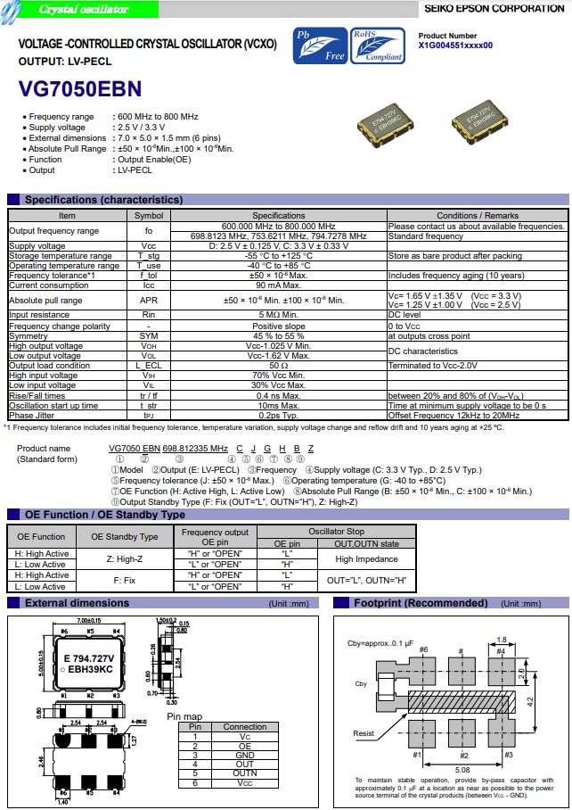 | X1G004551000800 | VG7050EBN | 698.812300MHz | 7.00x5.00x1.50mm | LV-PECL | 2.970 to 3.630 V |